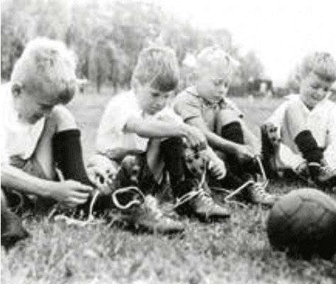 Na de Tweede Wereldoorlog werd voetbal een breedtesport, waaraan ook kinderen – eerst alleen jongens, later ook meisjes – gingen deelnemen. Op de foto uit 1950 strikken pupillen van VV Oldenzaal de schoenen op het toenmalige terrein in de Eekte.