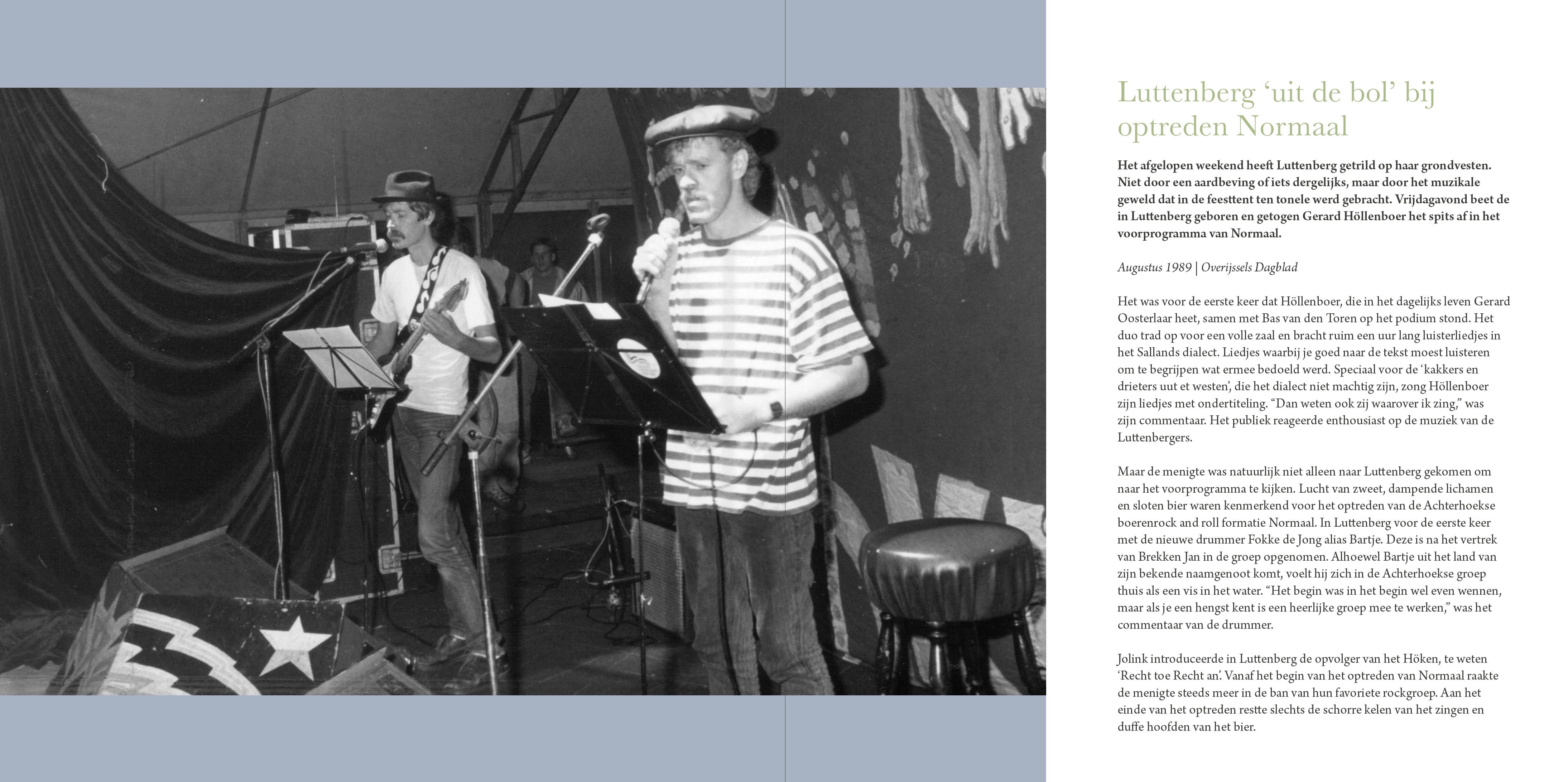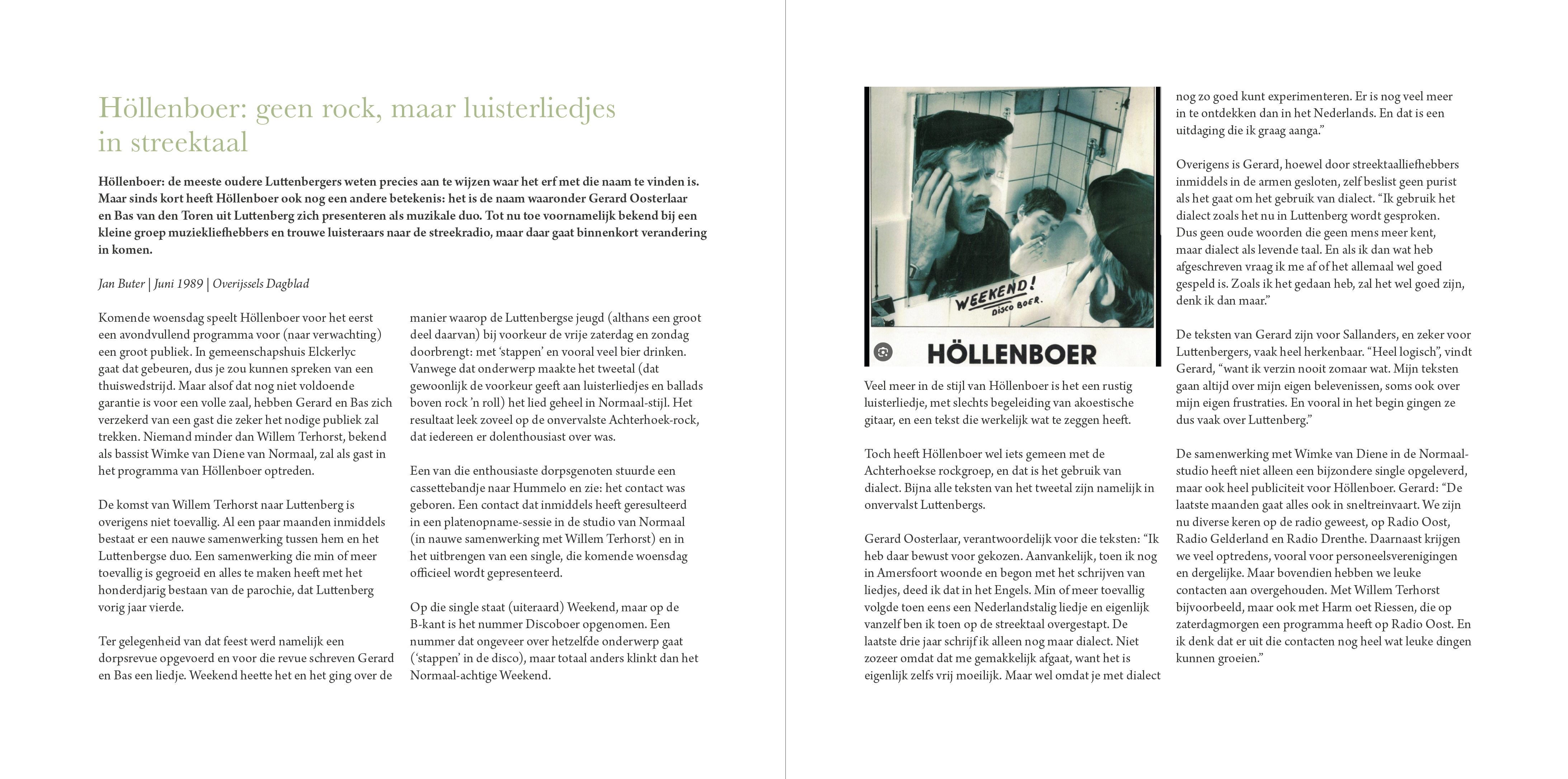 Het boek staat ook stil bij de geschiedenis van Höllenboer: het langdurige en bijzondere samenspel tussen Gerard Oosterlaar en Bas van den Toren, het onverwachte succes én de bewuste terugkeer naar de regio, en het gemis sinds het overlijden van Bas in 2022. In de geest van Bas ging Höllenboer door, samen met Hans Nieuwenhuis, die sinds 2007 mede het muzikale gezicht van de groep vormt.