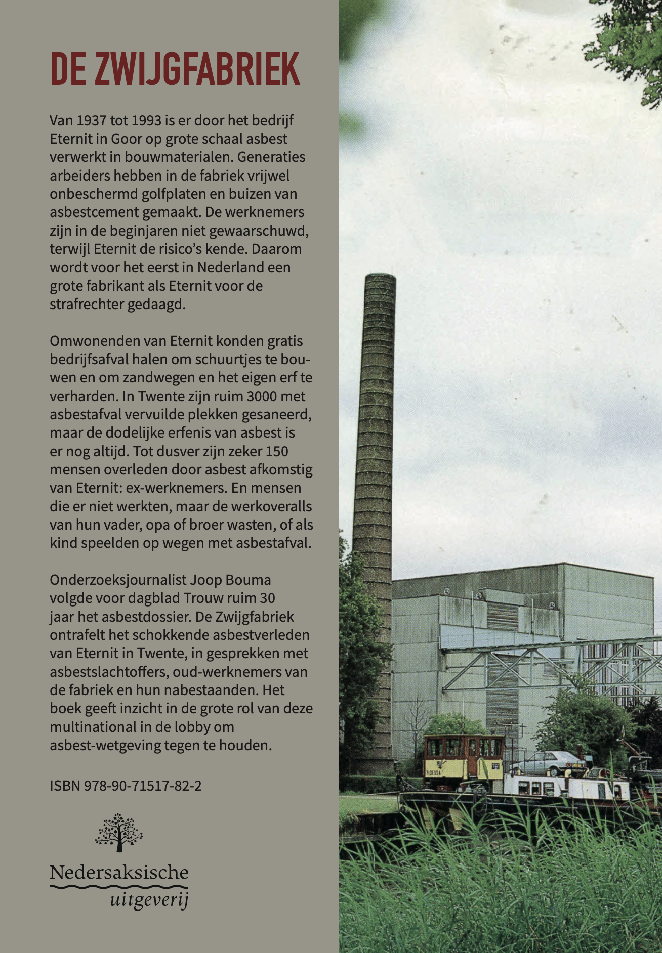 Onderzoeksjournalist Joop Bouma volgde voor dagblad Trouw ruim 30 jaar het asbestdossier. De Zwijgfabriek ontrafelt het schokkende asbestverleden van Eternit in Twente, in gesprekken met asbestslachtoffers, oud-werknemers van de fabriek en hun nabestaanden. De Zwijgfabriek geeft inzicht in de grote rol van deze multinational in de lobby om asbest-wetgeving tegen te houden.